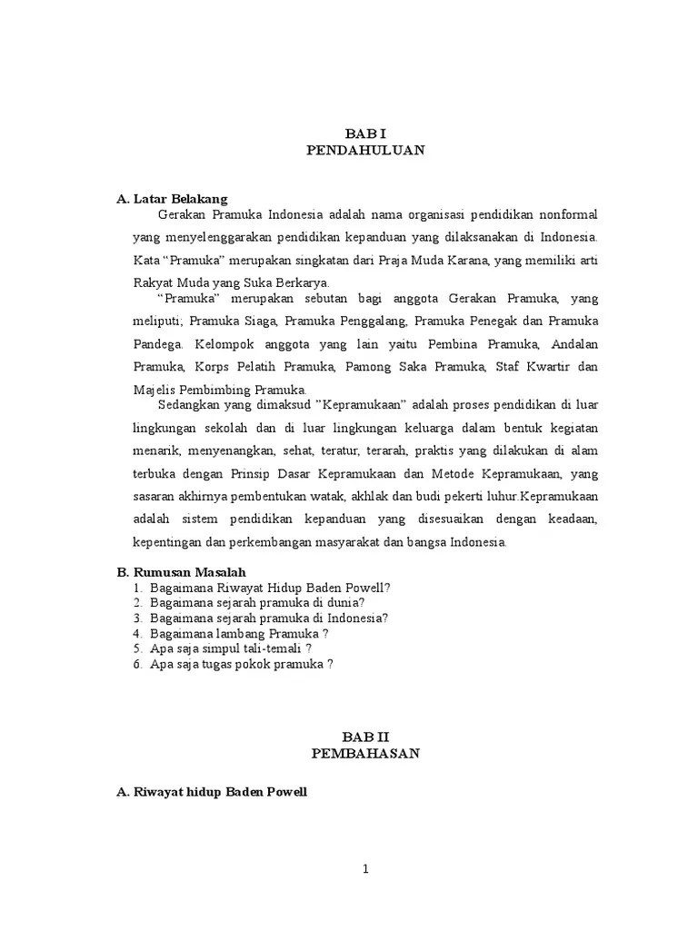 Sejarah berdirinya pramuka di dunia termasuk indonesia,tidak dapat lepas dari sosok lord baden powell. Harapan penulis, semoga makalah ini bisa menjadi acuan pengetahuan bagi para pembaca khususnya pengetahuan mengenai sejarah pramuka dunia. Makalah sejarah pramuka di indonesia, aldy sapta perdana 1513031018 kata pengantar salam . Pengetahuan dan tekhnologi (iptek), hanya kesadaran sejarah yang perlu. View makalah pramuka.docx from english 123 at lampung university. Awal tahun 1908 baden powell menulis pengalamannya untuk acara latihan kepramukaan yang dirintisnya. Latar belakang masalah pendidikan kepramukaan di indonesia merupakan salah satu segi pendidikan nasional yang sangat penting, yang . Sejarah menunjukkan bahwa pemuda indonesia mempunyai saham besar. Gerakan pramuka lahir pada tahun 1961, jadi kalau akan menyimak latar belakang lahirnya gerakan pramuka, orang perlu mengkaji . Untuk itu perlu diketahui sejarah perkembangan kepramukaan di indonesia. Scouting yang di kenal di indonesia dikenal dengan istilah. Kepramukaan, dikembangkan oleh lord baden powell sebagai. 1 kwartir nasional gerakan pramuka, 75 tahun kepanduan dan kepramukaan, jakarta,.