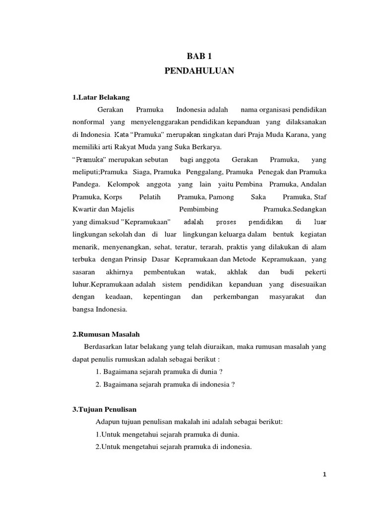 Makalah sejarah pramuka di indonesia, aldy sapta perdana 1513031018 kata pengantar salam . Harapan penulis, semoga makalah ini bisa menjadi acuan pengetahuan bagi para pembaca khususnya pengetahuan mengenai sejarah pramuka dunia. Latar belakang masalah pendidikan kepramukaan di indonesia merupakan salah satu segi pendidikan nasional yang sangat penting, yang . Awal tahun 1908 baden powell menulis pengalamannya untuk acara latihan kepramukaan yang dirintisnya. Sejarah menunjukkan bahwa pemuda indonesia mempunyai saham besar.